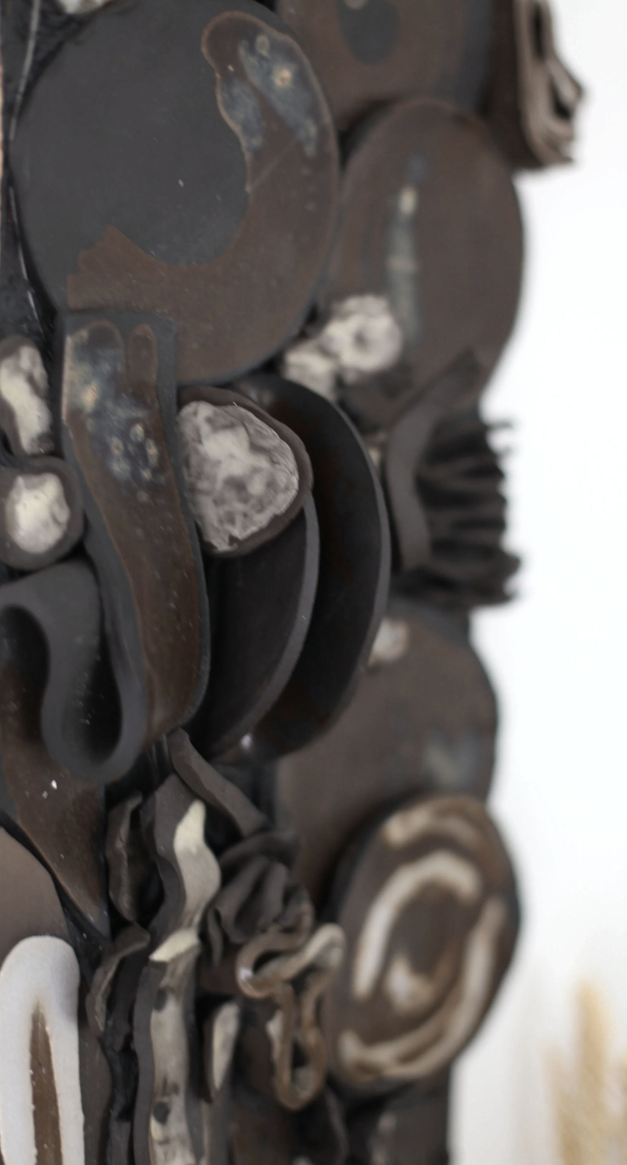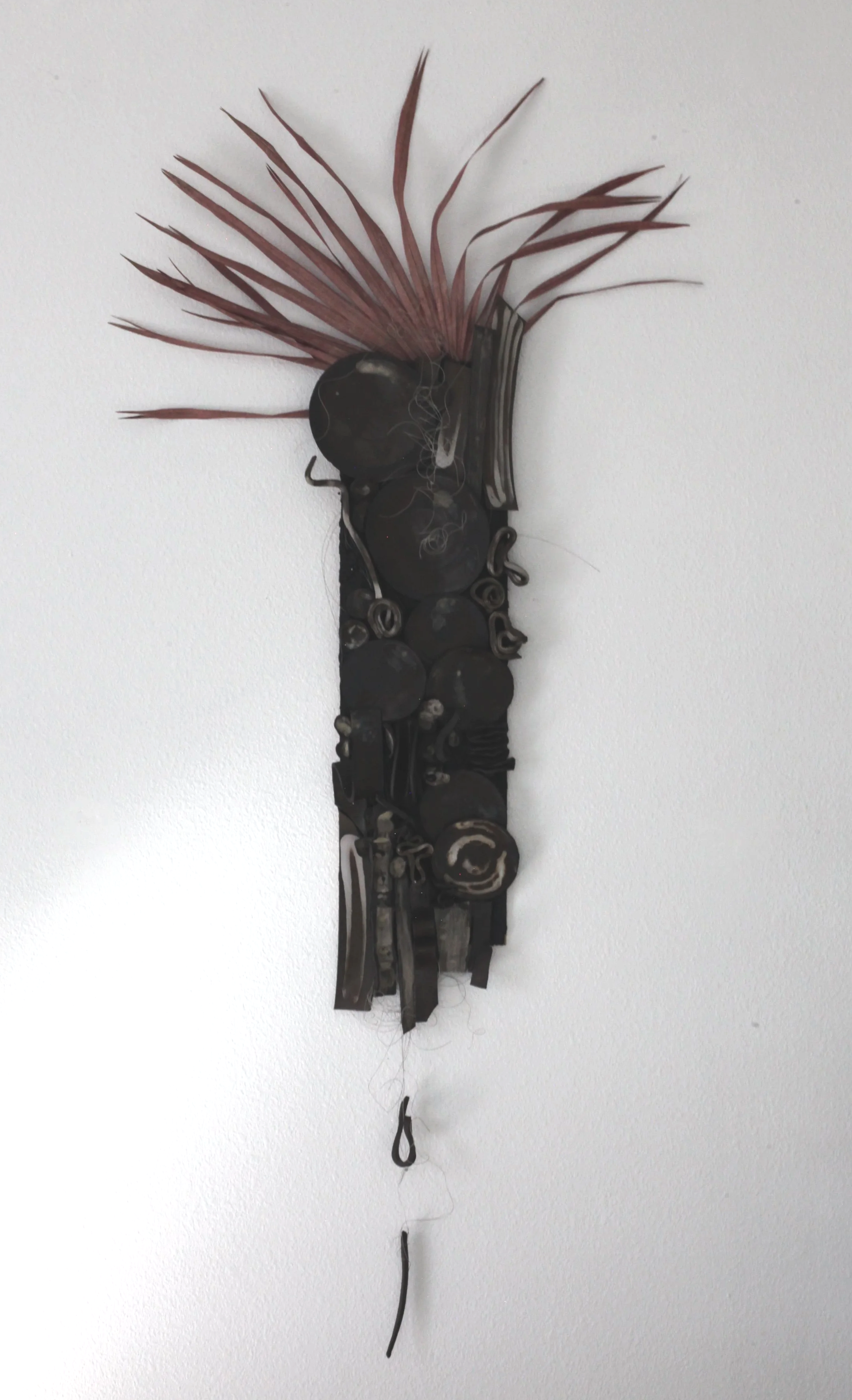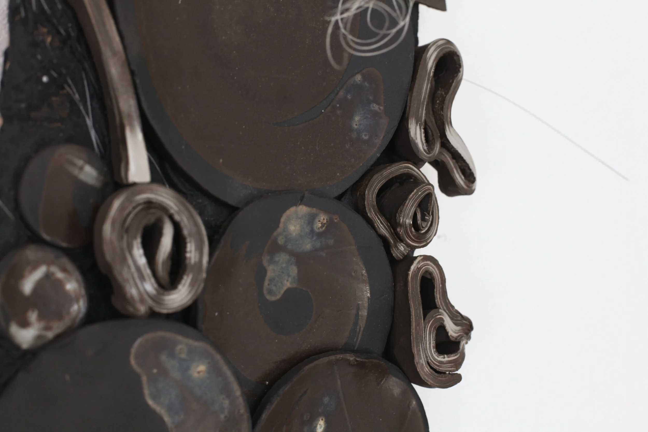 Ceramic, brown stoneware, glaze, watercolor, wire, dried palm, plaster on Wood.